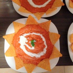 Paradicsomleves zöld fűszerekkel készítve, nachos-szal, újhagymával, és joghurttal tálalva
